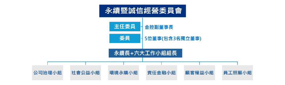 本公司以「積極參與公共事務,並促進經濟、社會與環境生態之平衡及永續發展實踐企業社會責任」為政策目標,設置具董事會層級之永續暨誠信經營委員會,由本公司董事擔任委員(包含三位獨立董事),並下設公司治理、社會公益、環境永續、責任金融、顧客權益與員工照顧等六個任務工作小組,由總經理下高階管理層擔任小組長,負責各自領域年度推動計畫之擬定與執行,並由永續長統籌公司整體永續策略與方向,確保各小組推動一致性。營運暨永續發展處為永續發展相關事務之專職單位並擔任本委員會幕僚單位,承擔跨部門協調與資源整合,隸屬永續長管理,確保永續政策與目標落實於各項營運活動。