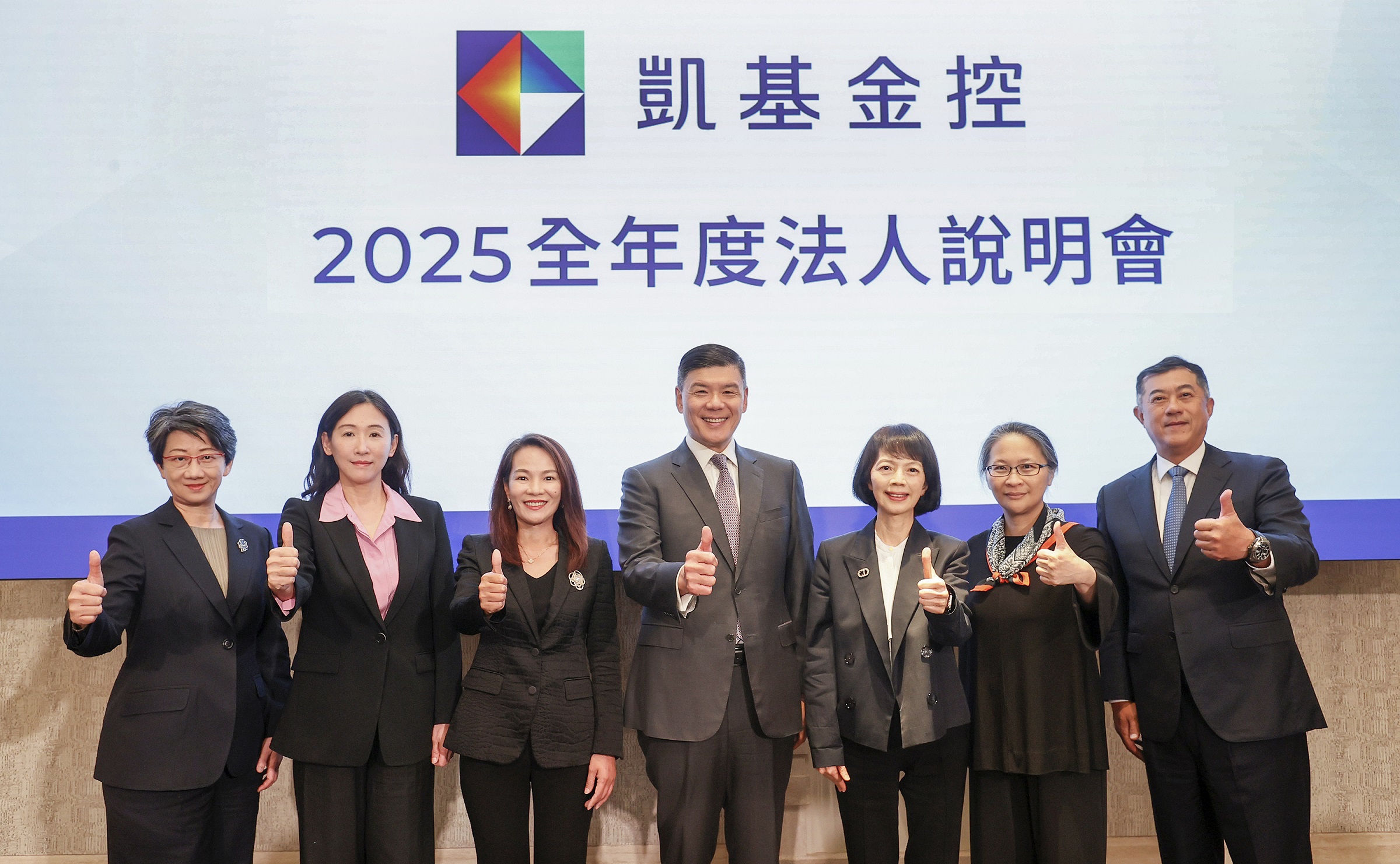 新聞圖說:凱基金控今日舉辦法人說明會,集團團隊共同說明2025全年度財務表現及策略報告。(左起:凱基投信總經理張慈恩、凱基金控財務長黃碧玲、凱基銀行總經理林素真、凱基金控總經理楊文鈞、凱基人壽總經理郭瑜玲、中華開發資本總經理南怡君、凱基證券總經理林志宏)